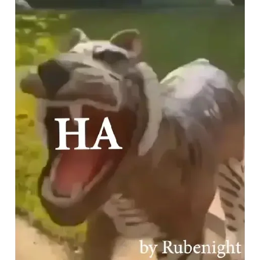 Um tigre com a boca aberta e olhos arregalados, com o texto 'HA' sobreposto em branco. O fundo mostra grama verde.