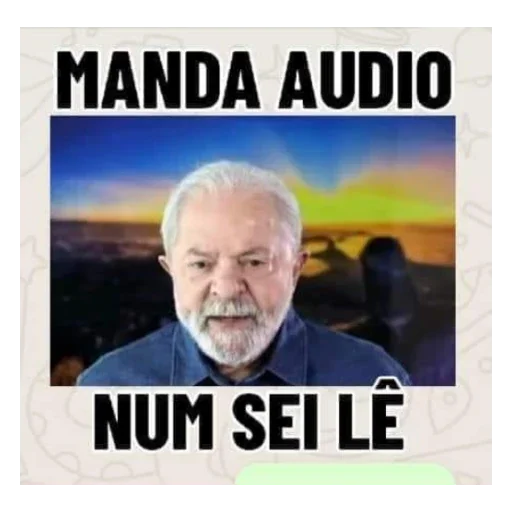 Um homem mais velho com cabelo e barba grisalhos aparece em frente a um pôr do sol. Ele está usando uma camisa azul. A imagem tem um texto em preto que diz 'MANDA AUDIO' na parte superior e 'NUM SEI LÊ' na parte inferior.