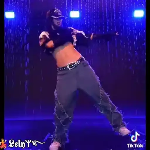Uma mulher dançando em um palco com luzes azuis, usando um chapéu, blazer preto e calça jeans, com o logotipo do TikTok ao lado.
