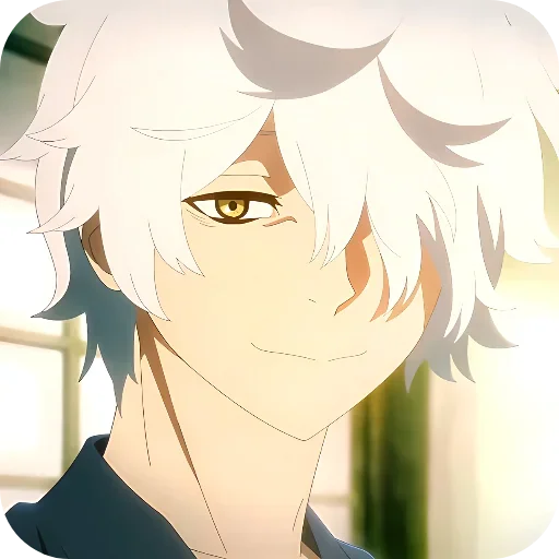 Rosto de um personagem de anime com cabelo branco e olhos castanhos. Ele está usando um casaco preto.