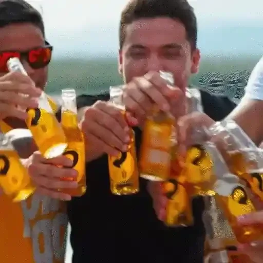 Dois homens segurando garrafas de cerveja, com um terceiro braço segurando outra garrafa à direita. Todos sorriem e brindam.