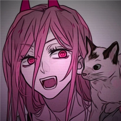 Uma garota de anime com chifres, cabelo rosa e olhos vermelhos surpresos, com um gato ao lado. Ela parece animada ou surpresa.