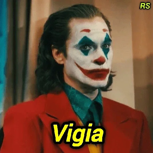 O Coringa com maquiagem branca, vermelha e preta no rosto, vestindo um terno vermelho e uma camisa verde, com o texto 'Vigia' sobreposto.