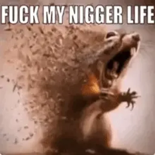 Um sticker de um rato com a boca aberta e poeira saindo de sua cabeça, com o texto 'Fuck my nigger life' em cima.