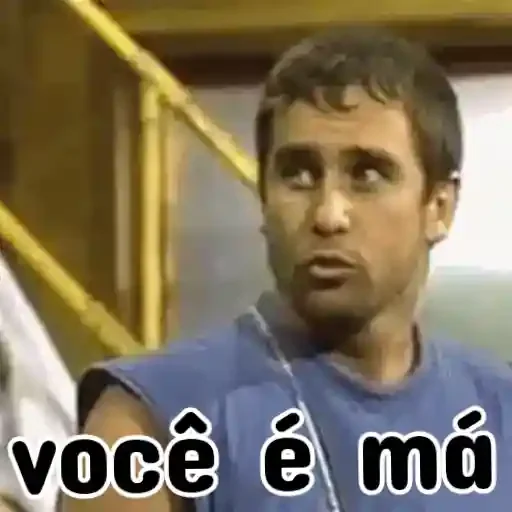 Homem com expressão séria e camiseta azul, fundo com grades amarelas. Texto 'você é má'.