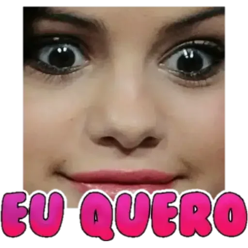 Rosto de uma mulher com olhos arregalados e expressão de desejo, com o texto 'EU QUERO' em letras rosa abaixo.