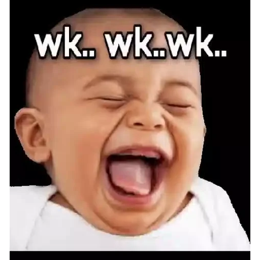 Um bebê com os olhos fechados e a boca aberta, parecendo chorar ou gritar. A imagem tem o texto 'wk.. wk..wk..' sobreposto.