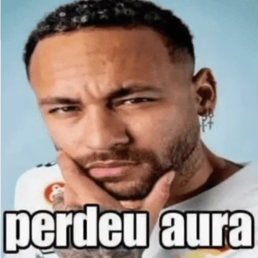 Homem com expressão pensativa, mão no queixo e olhar para baixo, com o texto 'perdeu aura' em destaque.