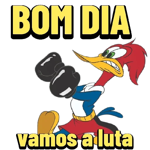 Um cartoon de um pássaro vermelho com expressão determinada, vestindo um traje de luta, com os dizeres 'BOM DIA vamos a luta'