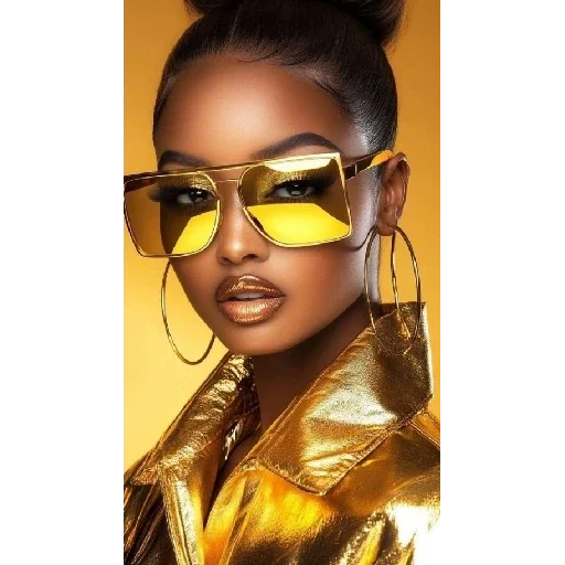 Mulher com cabelo preso, óculos de sol espelhados dourados e jaqueta dourada, fundo laranja.