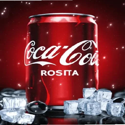 Lata de Coca-Cola Rosita, com gelo ao redor, em fundo vermelho com faíscas.