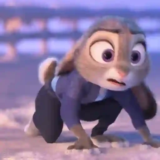 Um coelho de olhos arregalados e expressão surpresa, vestindo um terno azul e preto, em uma postura agachada.