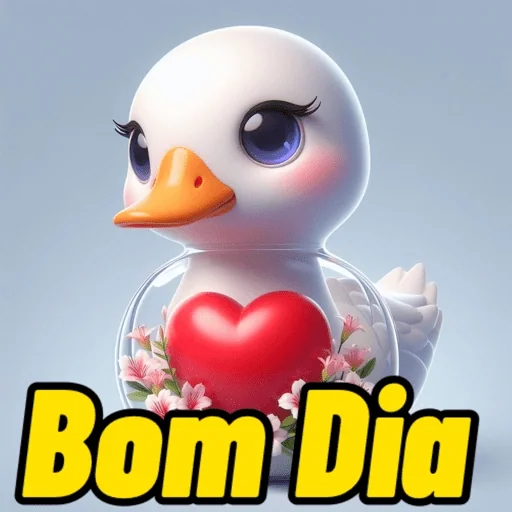Um desenho de um pato branco com olhos grandes e cílios, segurando um coração vermelho e flores, com a frase 'Bom Dia' em letras amarelas.