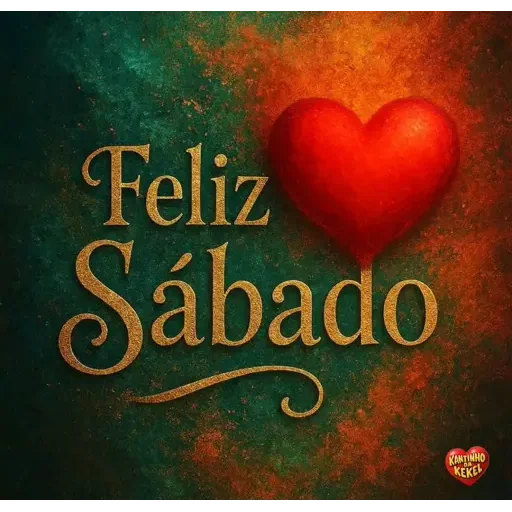 Um coração vermelho ao lado do texto 'Feliz Sábado' em letras douradas, sobre um fundo verde e laranja.