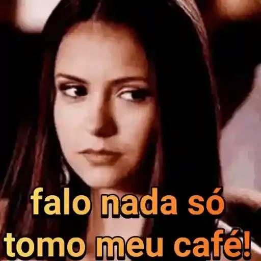 Uma imagem de uma mulher com expressão séria e cabelos castanhos, com o texto "falo nada só tomo meu café!" sobreposto.