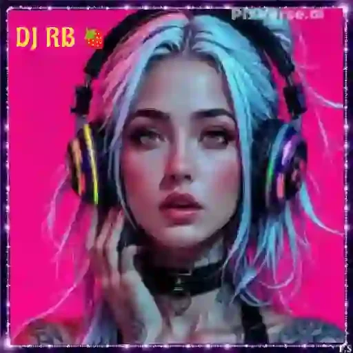 Uma mulher com cabelos azuis e fones de ouvido, fundo rosa. 'DJ RB' no canto superior esquerdo.