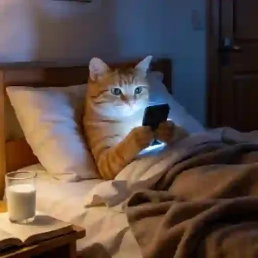 Gato laranja deitado na cama com um celular na pata, ao lado de um copo de leite.