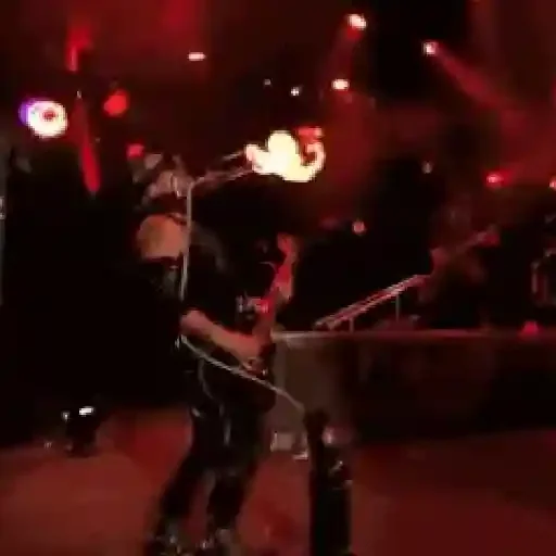 Homem em palco com guitarra e fogo saindo da boca, em ambiente com iluminação vermelha.