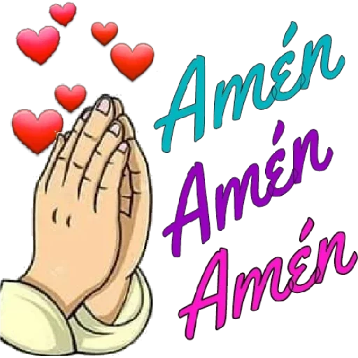 Mãos juntas em oração com a palavra 'Amém' três vezes e corações vermelhos ao redor.