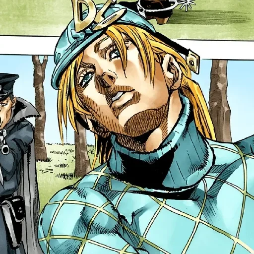 Personagem de anime com cabelo loiro e roupa azul xadrez, parecendo um caçador, com outro personagem ao fundo.