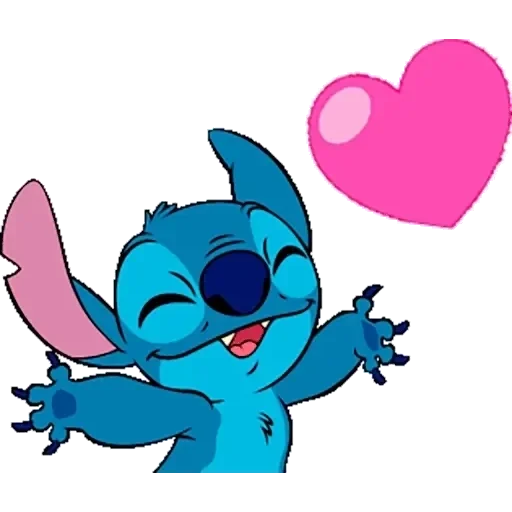 Stitch com os olhos fechados e um sorriso, estendendo os braços com uma orelha rosa e um coração rosa ao lado.