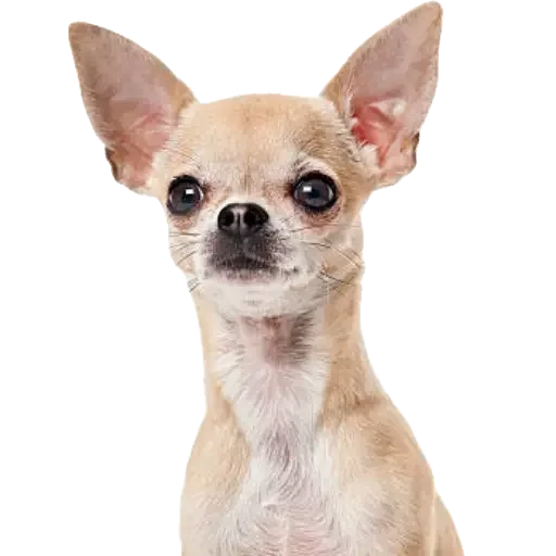 Um cachorro Chihuahua com orelhas grandes e olhos pretos redondos, com pelagem bege e branca.