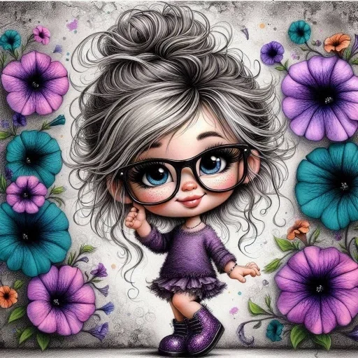 Uma menina cartoon com cabelo grisalho e óculos pretos, vestida de roupa roxa, sorrindo e fazendo um gesto com a mão, cercada de flores coloridas.