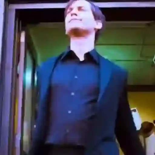 Homem de terno azul escuro e camisa preta olhando para cima com expressão séria, em um ambiente com iluminação verde ao fundo.