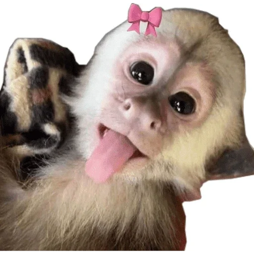 Macaco com a língua de fora e um laço rosa na cabeça, com expressão engraçada e olhos grandes.