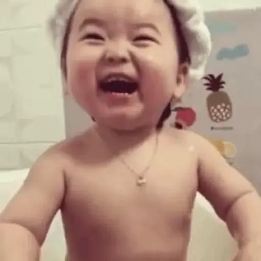 Um bebê sem camisa, com touca de banho na cabeça, sorrindo e com a boca aberta, em um ambiente de banheiro com uma parede decorada com uma pinha e outras figuras.