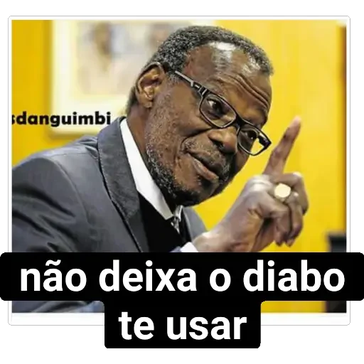 Um homem negro com cabelo curto e óculos, vestido com um terno cinza, apontando o dedo indicador para cima. Sobre a imagem, há um texto em preto 'danguimbi' e em branco 'não deixe o diabo te usar'.