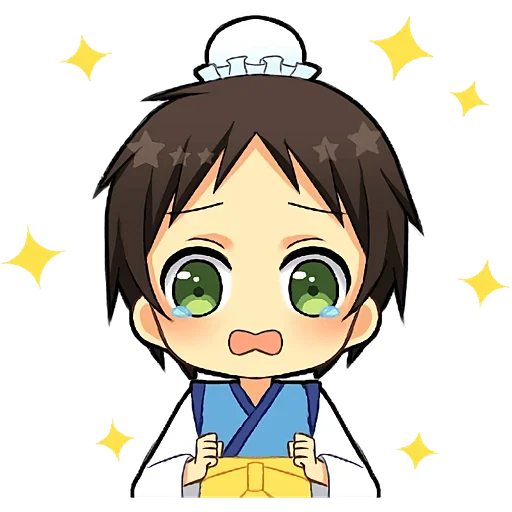 Personagem de anime com expressão surpresa, usando yukata azul e branco, com estrelas douradas ao redor.