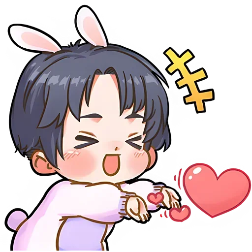 Menino de cabelo preto com orelhas de coelho, olhos fechados e bochechas rosadas, jogando um coração vermelho. Ele tem um '¥' amarelo ao lado da cabeça.
