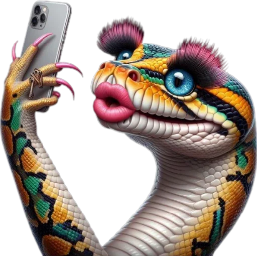 Uma cobra colorida com cílios postiços e unha pintada fazendo uma selfie com um celular, com a língua para fora e expressão engraçada.