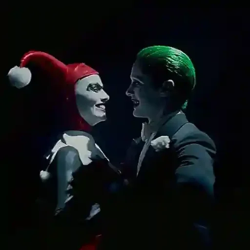 Joker e Batman se olhando, com Joker usando um chapéu de cor vermelha e Batman com um cabelo verde, ambos com expressões sérias.