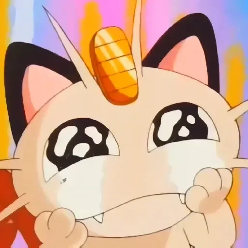 Um gato cartoon com olhos grandes e orelhas pretas, segurando a mão na boca com um gesto tímido ou surpreso, com um fundo colorido e um objeto laranja na cabeça.