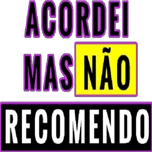 Uma figurinha com texto colorido que diz 'ACORDEI MAS NÃO RECOMENDO'. As letras são grandes e têm contorno roxo, com 'NÃO' destacado em um retângulo amarelo.