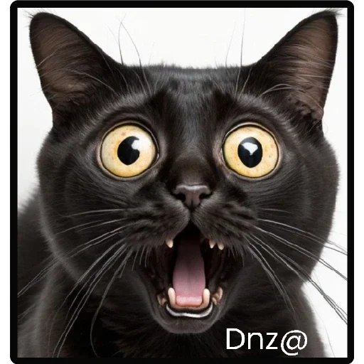 Gato preto com olhos amarelados arregalados e boca aberta, mostrando os dentes. O texto 'Dnz@' aparece no canto inferior direito.