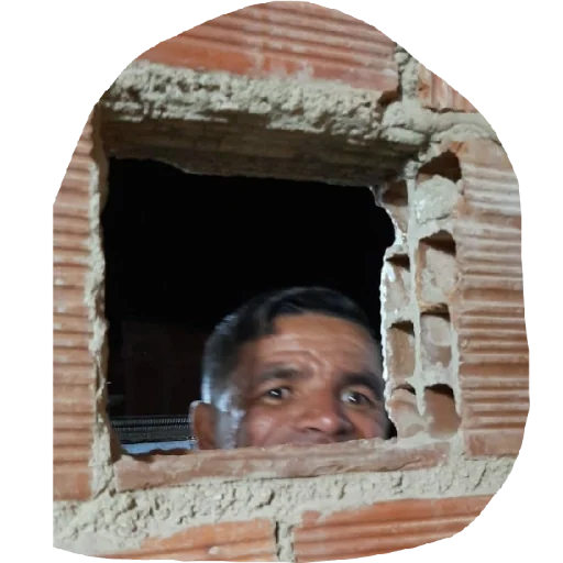 Um homem com cabelos castanhos e olhar surpreso espiando por uma janela de tijolos vermelhos danificada.