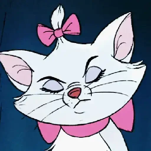 Gata branca com laço rosa no cabelo e colar rosa, fazendo careta com um olho fechado.