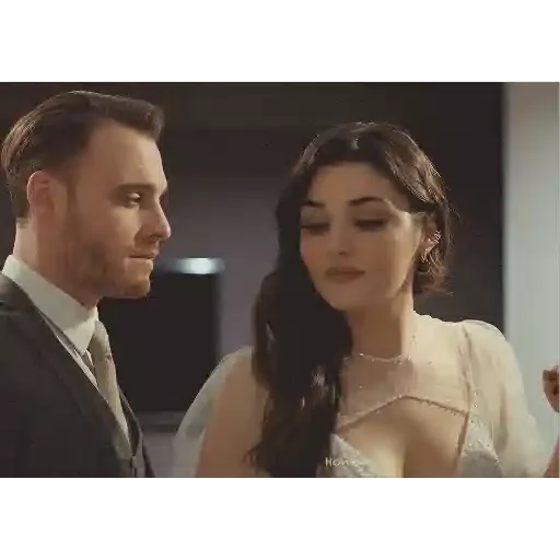 Um homem e uma mulher se olhando, ele de terno e gravata, ela de vestido branco.