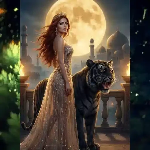Uma mulher de longos cabelos castanhos e um vestido dourado ao lado de um tigre preto em frente a uma cidade com uma grande lua cheia ao fundo.