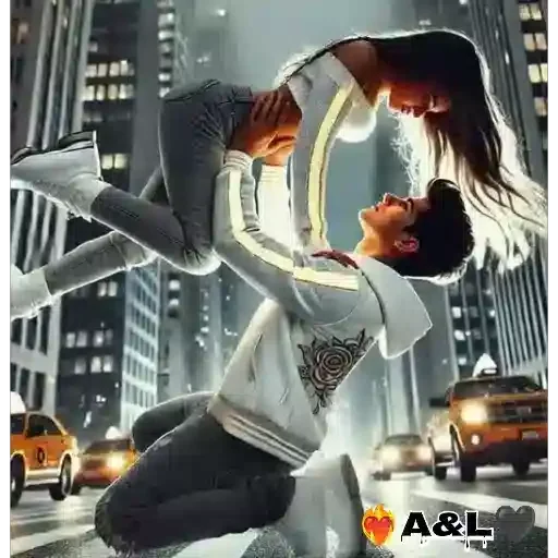 Um casal apaixonado em uma cidade noturna. O homem, com jaqueta branca, segura a mulher, com longos cabelos pretos, em seus braços enquanto eles se beijam.