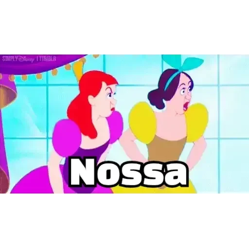 Duas mulheres de vestidos coloridos, uma de cabelo vermelho e outra de cabelo preto, com a palavra 'Nossa' em destaque.