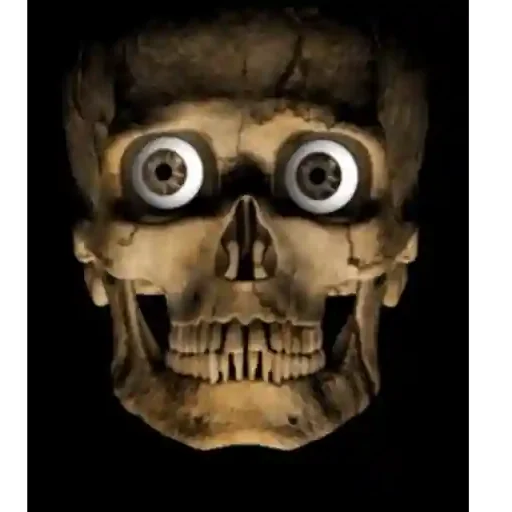 Uma caveira com olhos grandes e redondos, parecendo assustado ou surpreso, contra um fundo preto.