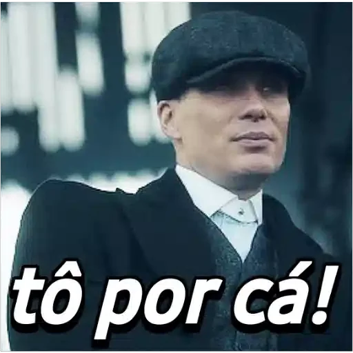 Um homem de expressão séria, vestido com um terno preto e um chapéu preto, com o texto 'tô por cá!' sobreposto na parte inferior.