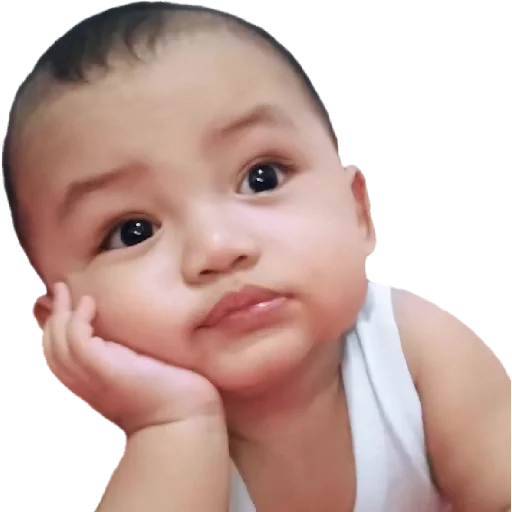 Um bebê com expressão pensativa, mão no rosto e olhar para cima, vestindo uma camiseta branca.