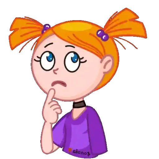 Menina de cabelos laranjas em coque duplo, com expressão pensativa e dedo no queixo.