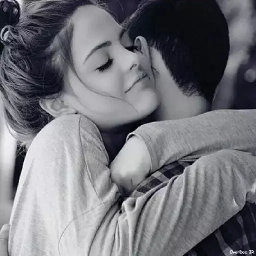 Um casal se abraçando, com o rosto da mulher encostado na cabeça do homem. A imagem é em preto e branco.