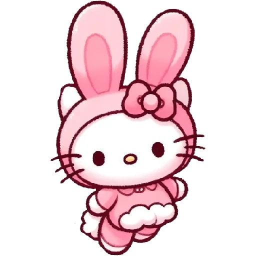 Rosto de Hello Kitty com um laço rosa, fazendo um gesto com a mão e com dois triângulos rosas atrás da cabeça.